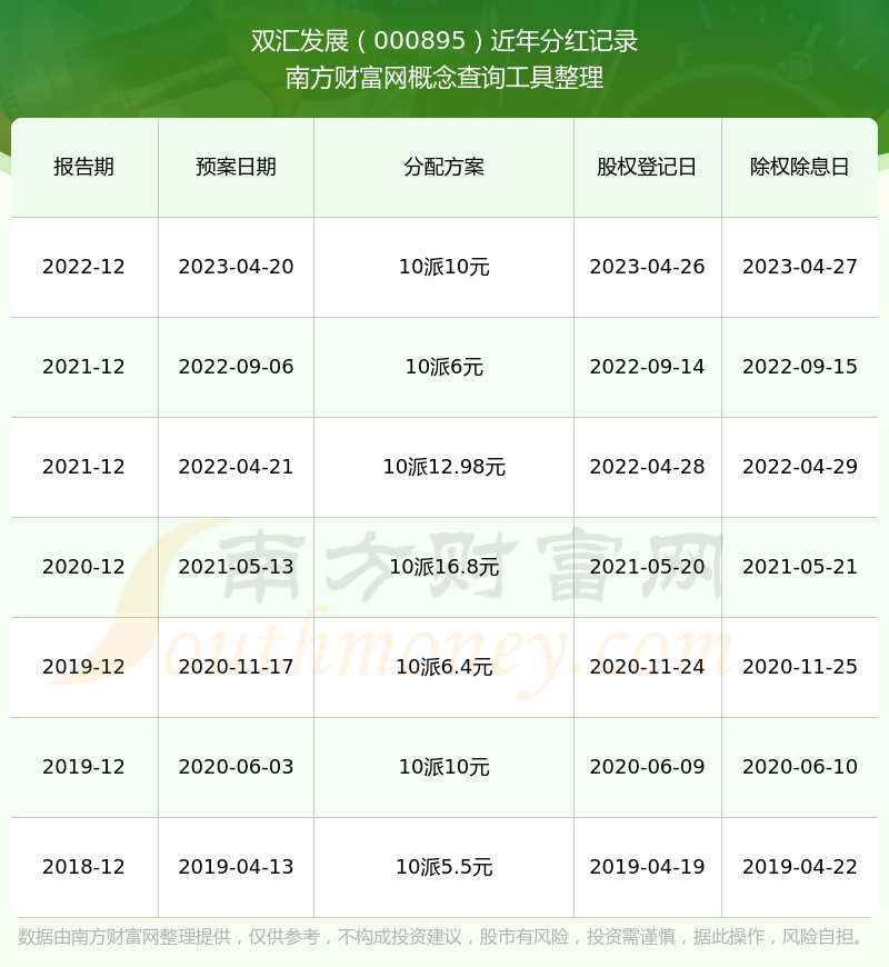 雙匯發(fā)展最新一次公布的分紅方案為10派10元。本次權(quán)益分派股權(quán)登記日為2023年4月26日,除權(quán)除息日為2023年4月27日,派息日為2023年4月27日。