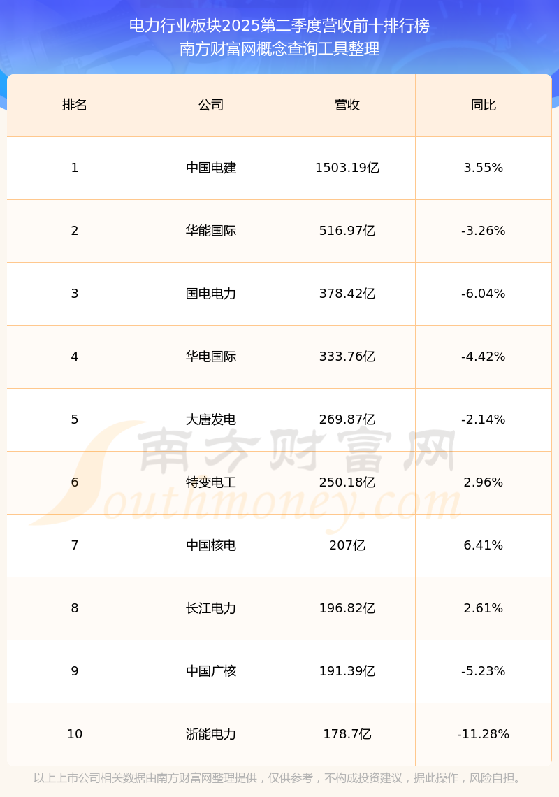 按照南方財(cái)富網(wǎng)概念查詢工具統(tǒng)計(jì),該股所屬板塊為電力行業(yè)板塊,該板塊共有93只股票,廣西能源2025第二季度營收在該板塊中排名為第59名,該板塊2025第二季度營收排名前十的股票如下表:
