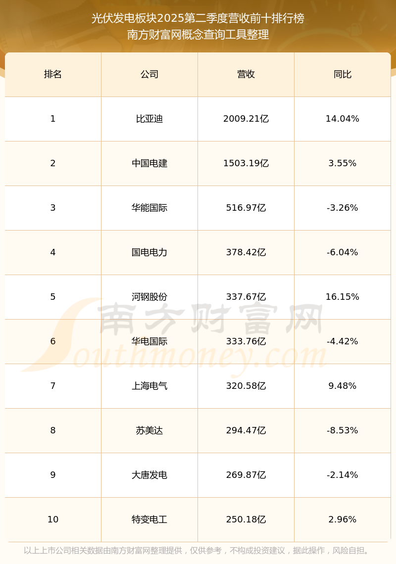 按照南方財富網(wǎng)概念查詢工具統(tǒng)計,該股所屬板塊為光伏發(fā)電板塊,該板塊共有248只股票,芯能科技2025第二季度營收在該板塊中排名為第222名,該板塊2025第二季度營收排名前十的股票如下表: