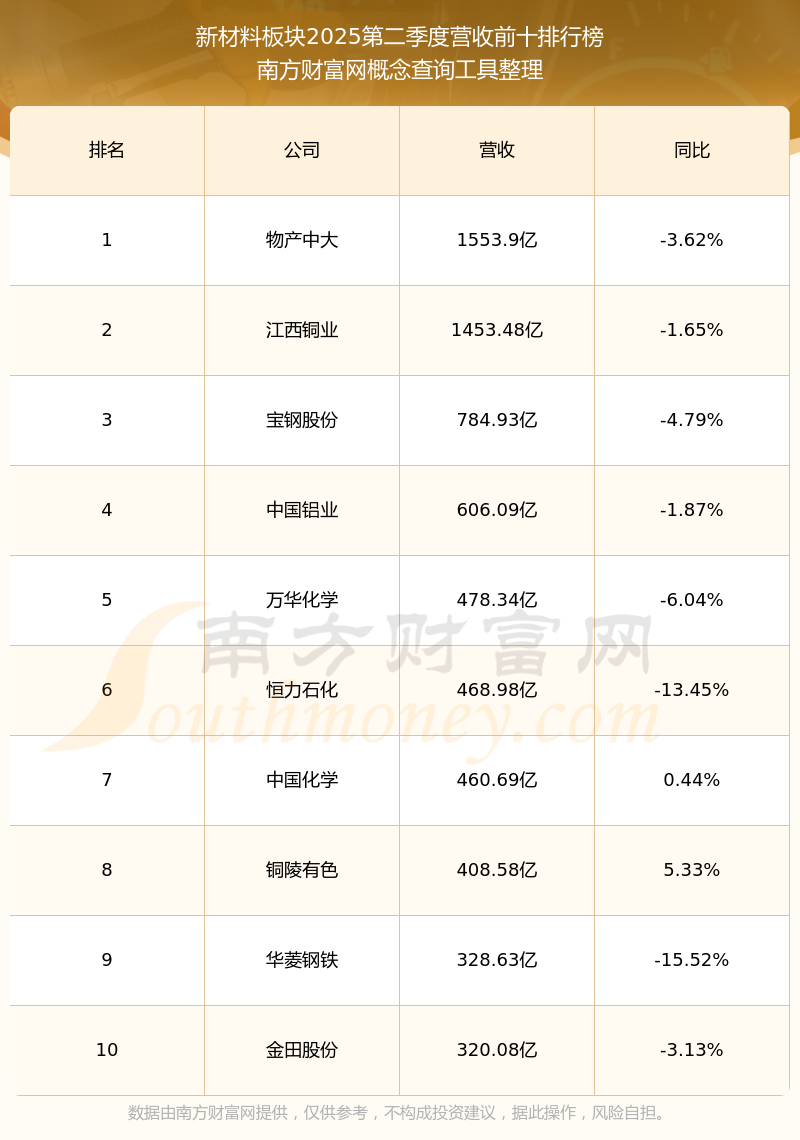 按照南方財富網(wǎng)概念查詢工具統(tǒng)計,該股所屬板塊為新材料板塊,該板塊共有560只股票,佳馳科技2025第二季度營收在該板塊中排名為第452名,該板塊2025第二季度營收排名前十的股票如下表: