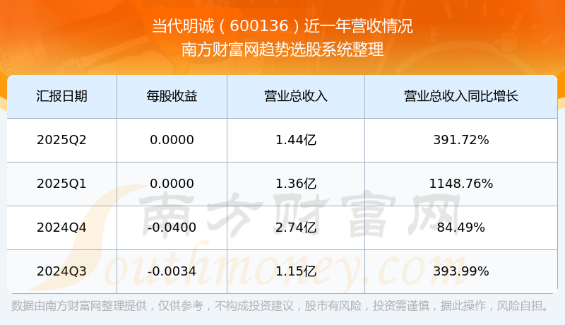 當代明誠(600136)發(fā)布2025年第二季度財報。2025年第二季度當代明誠實現(xiàn)營業(yè)收入1.44億元,同比增加391.72元%,環(huán)比增加6.16%;凈利潤為-418.04萬元,環(huán)比增長-180.71%。