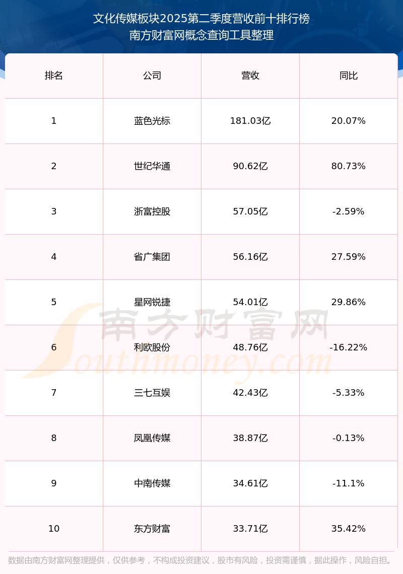 按照南方財富網(wǎng)概念查詢工具統(tǒng)計,該股所屬板塊為文化傳媒板塊,該板塊共有240只股票,當代明誠2025第二季度營收在該板塊中排名為第169名,該板塊2025第二季度營收排名前十的股票如下表: