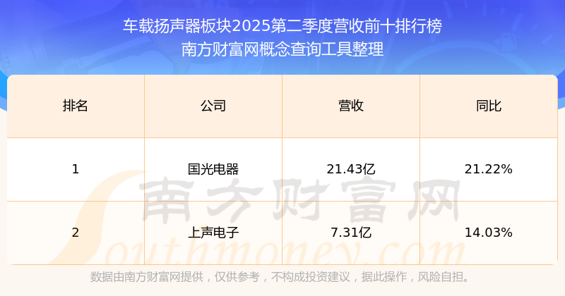 按照南方財富網(wǎng)概念查詢工具統(tǒng)計,該股所屬板塊為車載揚聲器板塊,該板塊共有2只股票,上聲電子2025第二季度營收在該板塊中排名為第2名,該板塊2025第二季度營收排名前十的股票如下表: