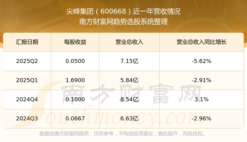 尖峰集團(tuán)2025年第二季度顯示,公司主營(yíng)收入7.15億元,同比-5.62%;歸母凈利潤(rùn)3537.72萬(wàn)元,同比-21.72%;扣非凈利潤(rùn)3480.01萬(wàn)元,同比-20.15%;