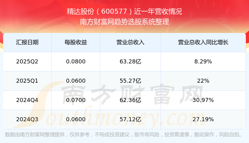 在2025年第二季度,精達(dá)股份的業(yè)績表現(xiàn),主營業(yè)務(wù)收入達(dá)到63.28億元,實(shí)現(xiàn)了8.29%的同比增長率。同時(shí),公司歸母凈利潤錄得1.81億元,同比增長0.71%。