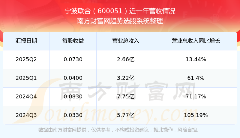 寧波聯(lián)合2025年第二季度顯示,公司主營收入2.66億元,同比13.44%;歸母凈利潤2109.23萬元,同比-44.04%;扣非凈利潤2010.84萬元,同比-51.81%;