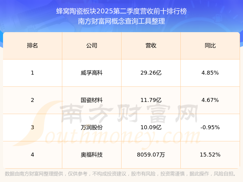 按照南方財富網(wǎng)概念查詢工具統(tǒng)計,該股所屬板塊為蜂窩陶瓷板塊,該板塊共有4只股票,奧?萍2025第二季度營收在該板塊中排名為第4名,該板塊2025第二季度營收排名前十的股票如下表: