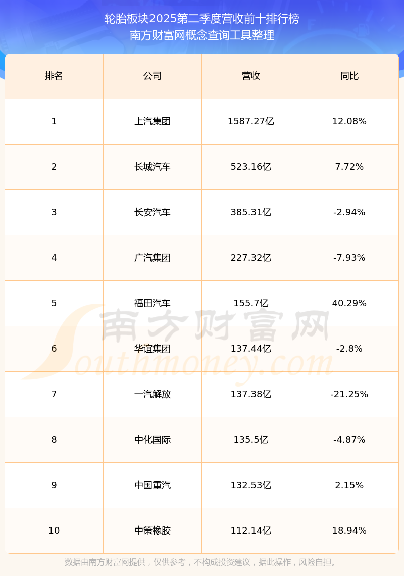 按照南方財富網(wǎng)概念查詢工具統(tǒng)計,該股所屬板塊為輪胎板塊,該板塊共有57只股票,中策橡膠2025第二季度營收在該板塊中排名為第10名,該板塊2025第二季度營收排名前十的股票如下表: