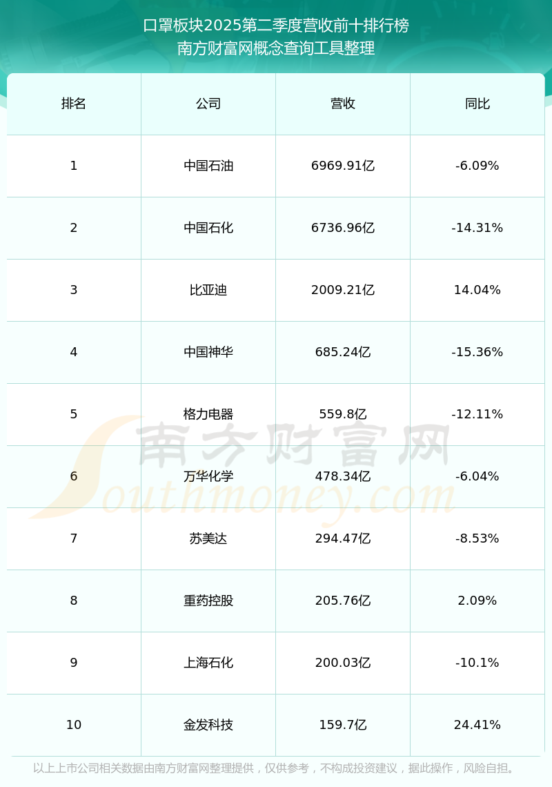 按照南方財(cái)富網(wǎng)概念查詢(xún)工具統(tǒng)計(jì),該股所屬板塊為口罩板塊,該板塊共有211只股票,振德醫(yī)療2025第二季度營(yíng)收在該板塊中排名為第73名,該板塊2025第二季度營(yíng)收排名前十的股票如下表: