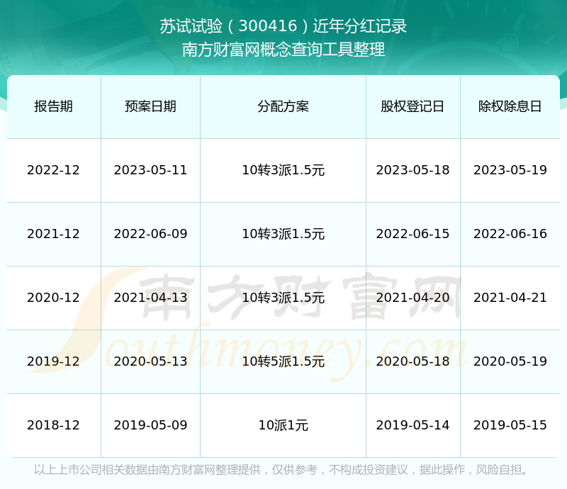 蘇試試驗最新一次公布的分紅方案為10轉(zhuǎn)3派1.5元。本次權(quán)益分派股權(quán)登記日為2023年5月18日,除權(quán)除息日為2023年5月19日,派息日為2023年5月19日。