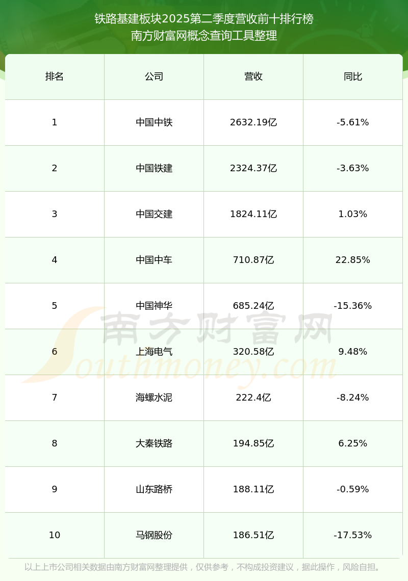 按照南方財(cái)富網(wǎng)概念查詢工具統(tǒng)計(jì),該股所屬板塊為鐵路基建板塊,該板塊共有168只股票,大秦鐵路2025第二季度營(yíng)收在該板塊中排名為第8名,該板塊2025第二季度營(yíng)收排名前十的股票如下表: