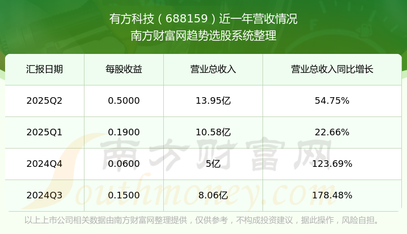 有方科技2025年第二季度顯示,公司主營(yíng)收入13.95億元,同比54.75%;歸母凈利潤(rùn)4596.46萬元,同比101.05%;扣非凈利潤(rùn)4141.55萬元,同比82.56%;
