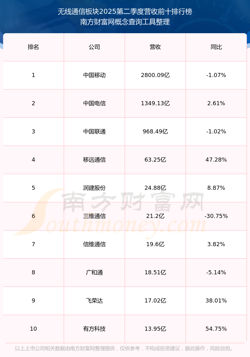 按照南方財(cái)富網(wǎng)概念查詢工具統(tǒng)計(jì),該股所屬板塊為無線通信板塊,該板塊共有30只股票,有方科技2025第二季度營(yíng)收在該板塊中排名為第10名,該板塊2025第二季度營(yíng)收排名前十的股票如下表: