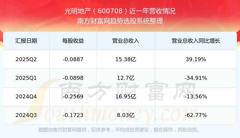 于2025年第二季度,光明地產(chǎn)披露了其業(yè)績表現(xiàn),其中主營業(yè)務(wù)收入15.38億元,相較于去年同期39.19%。此外,公司歸屬于母公司的凈利潤為-1.98億元,同比增長了-3638695.64%。在扣除所有非經(jīng)常性損益后,凈利潤-2.04億元,同比增長-225.41%。