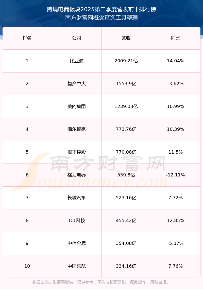 按照南方財(cái)富網(wǎng)概念查詢工具統(tǒng)計(jì),該股所屬板塊為跨境電商板塊,該板塊共有414只股票,蘇豪弘業(yè)2025第二季度營收在該板塊中排名為第114名,該板塊2025第二季度營收排名前十的股票如下表: