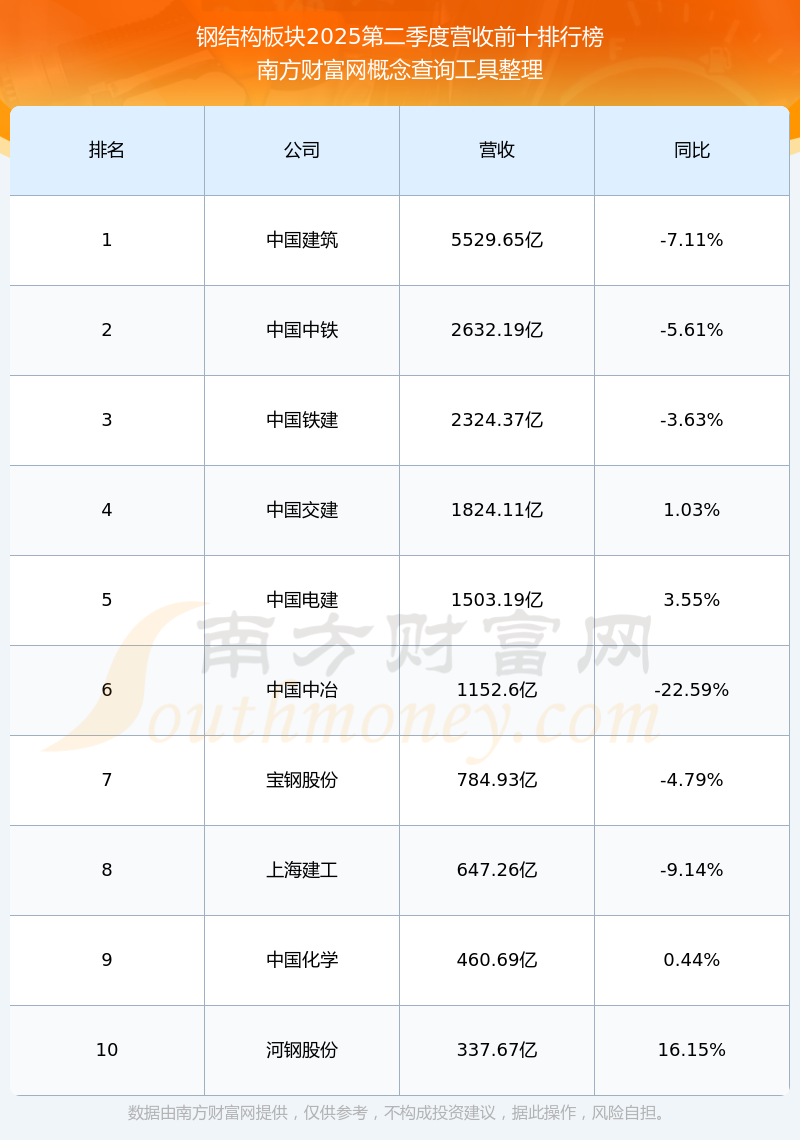 按照南方財(cái)富網(wǎng)概念查詢工具統(tǒng)計(jì),該股所屬板塊為鋼結(jié)構(gòu)板塊,該板塊共有46只股票,精工鋼構(gòu)2025第二季度營(yíng)收在該板塊中排名為第25名,該板塊2025第二季度營(yíng)收排名前十的股票如下表: