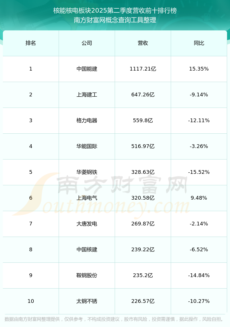 按照南方財富網(wǎng)概念查詢工具統(tǒng)計,該股所屬板塊為核能核電板塊,該板塊共有175只股票,福能股份2025第二季度營收在該板塊中排名為第39名,該板塊2025第二季度營收排名前十的股票如下表: