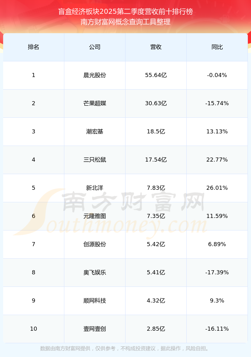 按照南方財(cái)富網(wǎng)概念查詢工具統(tǒng)計(jì),該股所屬板塊為盲盒經(jīng)濟(jì)板塊,該板塊共有15只股票,沐邦高科2025第二季度營(yíng)收在該板塊中排名為第13名,該板塊2025第二季度營(yíng)收排名前十的股票如下表: