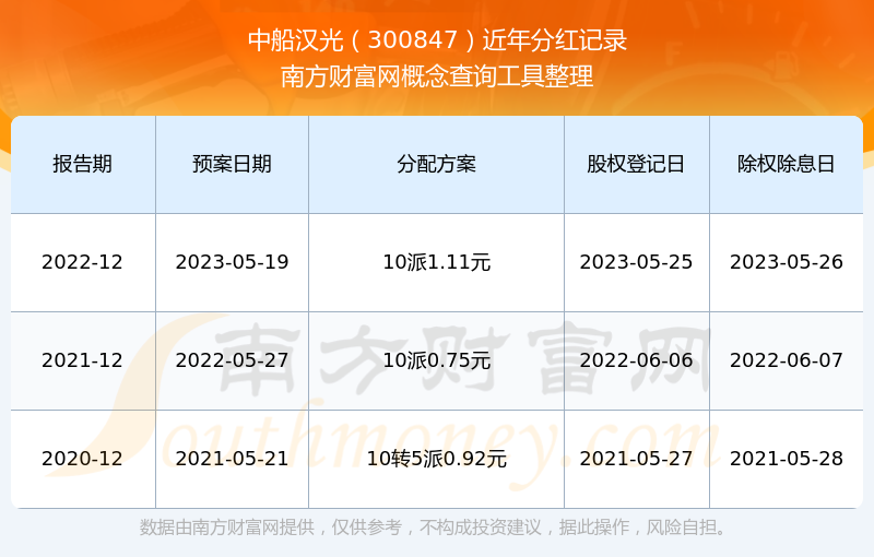 中船漢光最新一次公布的分紅方案為10派1.11元。本次權(quán)益分派股權(quán)登記日為2023年5月25日,除權(quán)除息日為2023年5月26日,派息日為2023年5月26日。
