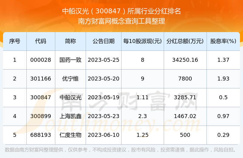 按照南方財(cái)富網(wǎng)趨勢(shì)選股系統(tǒng)統(tǒng)計(jì),中船漢光所屬行業(yè)為耗材行業(yè),耗材行業(yè)分紅排名情況如下表:
