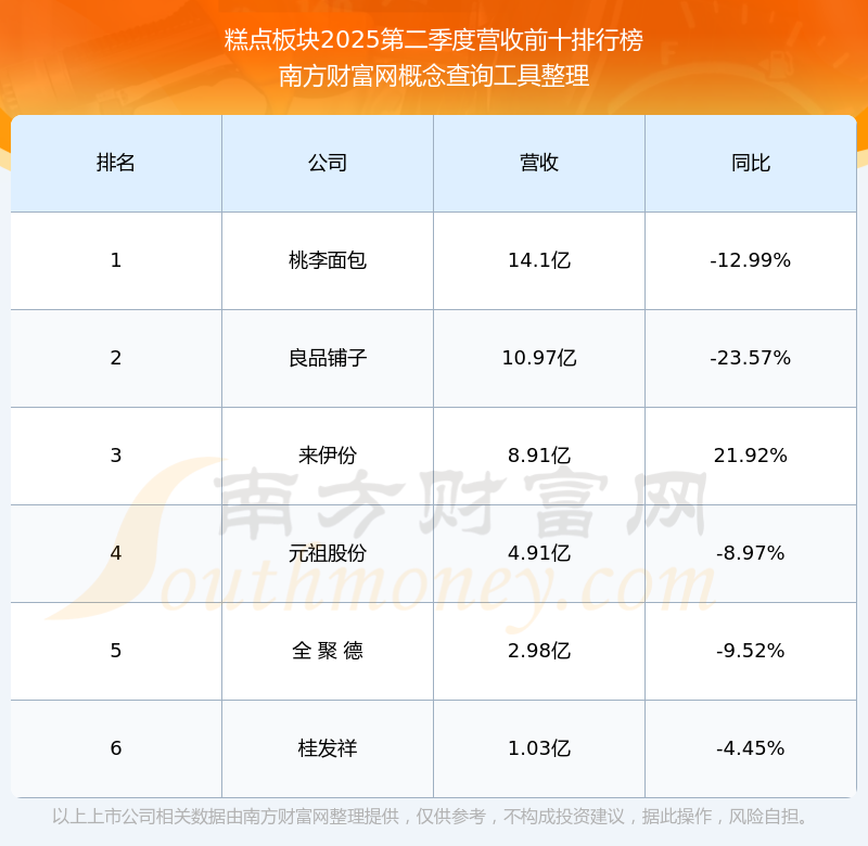 按照南方財富網(wǎng)概念查詢工具統(tǒng)計,該股所屬板塊為糕點板塊,該板塊共有6只股票,桃李面包2025第二季度營收在該板塊中排名為第1名,該板塊2025第二季度營收排名前十的股票如下表: