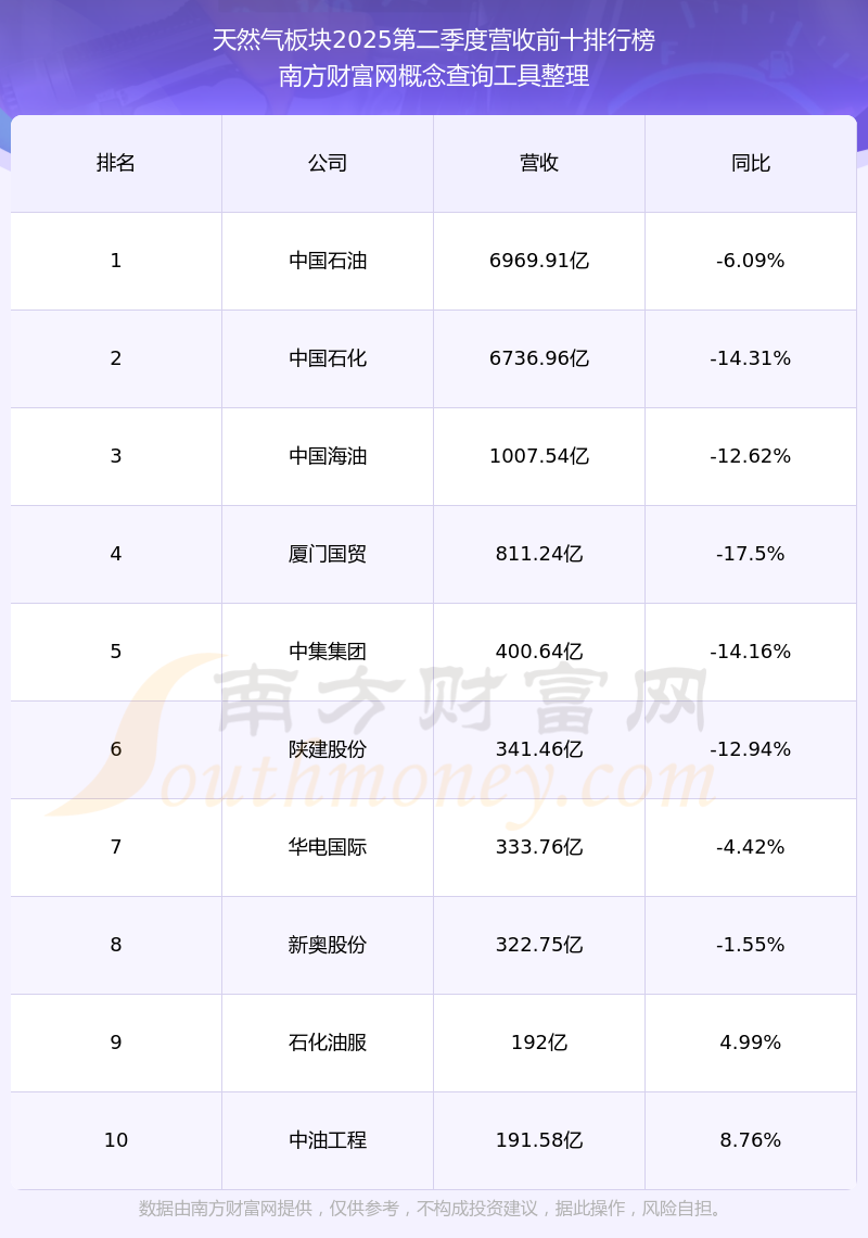 按照南方財富網概念查詢工具統(tǒng)計,該股所屬板塊為天然氣板塊,該板塊共有154只股票,樂山電力2025第二季度營收在該板塊中排名為第85名,該板塊2025第二季度營收排名前十的股票如下表: