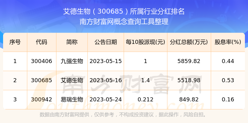 按照南方財(cái)富網(wǎng)趨勢(shì)選股系統(tǒng)統(tǒng)計(jì),艾德生物所屬行業(yè)為檢測(cè)試劑行業(yè),檢測(cè)試劑行業(yè)分紅排名情況如下表:
