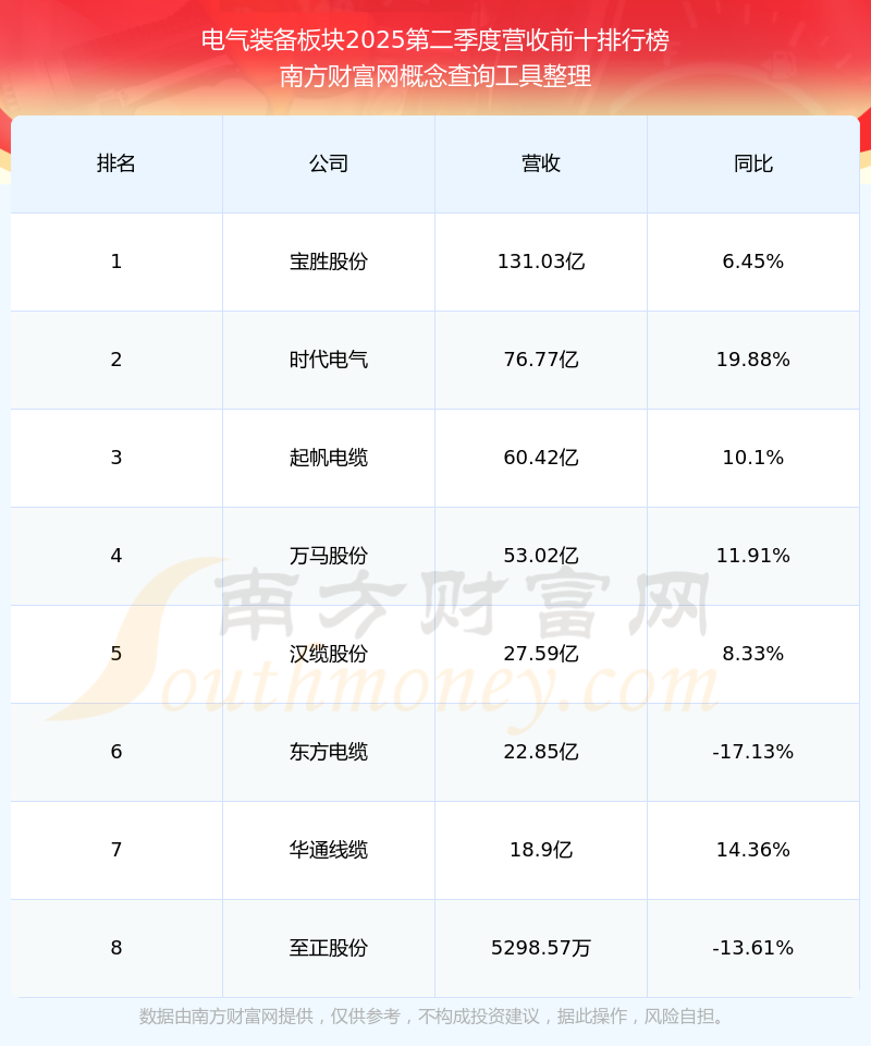按照南方財富網(wǎng)概念查詢工具統(tǒng)計,該股所屬板塊為電氣裝備板塊,該板塊共有8只股票,寶光股份2025第二季度營收在該板塊中排名為第8名,該板塊2025第二季度營收排名前十的股票如下表: