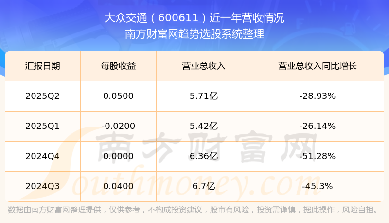 大眾交通2025年第二季度顯示,公司主營(yíng)收入5.71億元,同比-28.93%;歸母凈利潤(rùn)1.12億元,同比19.72%;扣非凈利潤(rùn)-2886.26萬元,同比-129.37%。