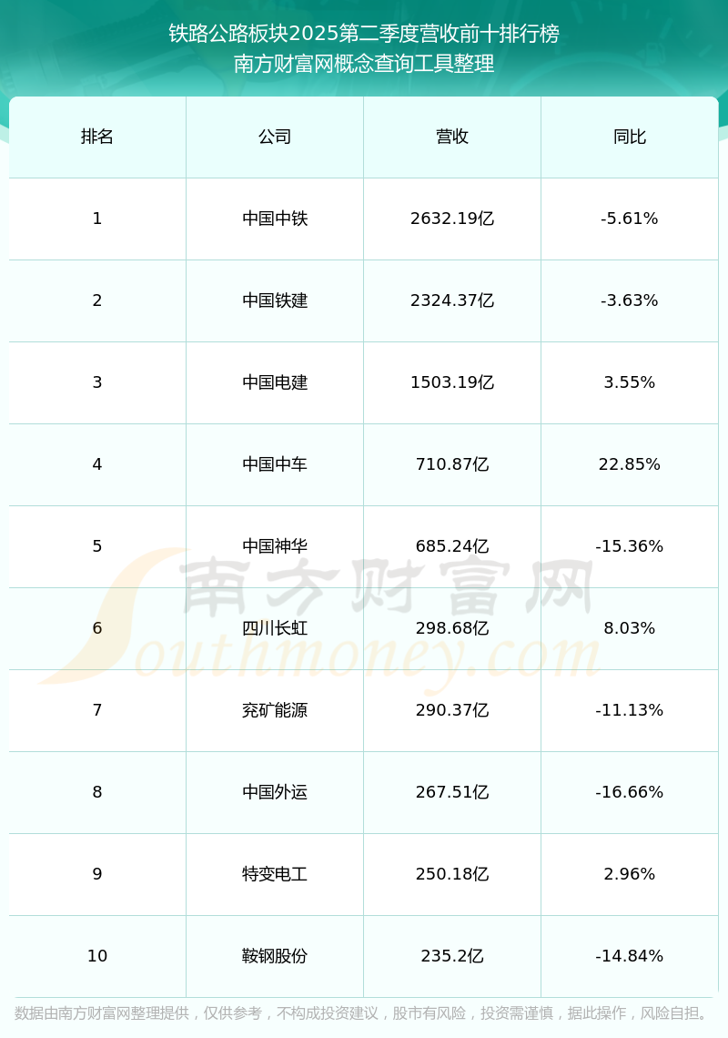 按照南方財(cái)富網(wǎng)概念查詢工具統(tǒng)計(jì),該股所屬板塊為鐵路公路板塊,該板塊共有120只股票,大眾交通2025第二季度營(yíng)收在該板塊中排名為第120名,該板塊2025第二季度營(yíng)收排名前十的股票如下表: