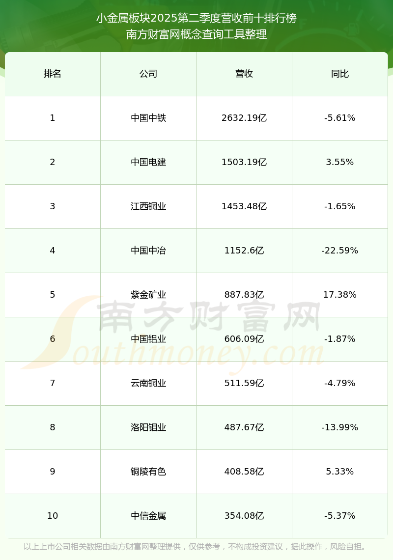 按照南方財富網(wǎng)概念查詢工具統(tǒng)計,該股所屬板塊為小金屬板塊,該板塊共有173只股票,永杉鋰業(yè)2025第二季度營收在該板塊中排名為第97名,該板塊2025第二季度營收排名前十的股票如下表: