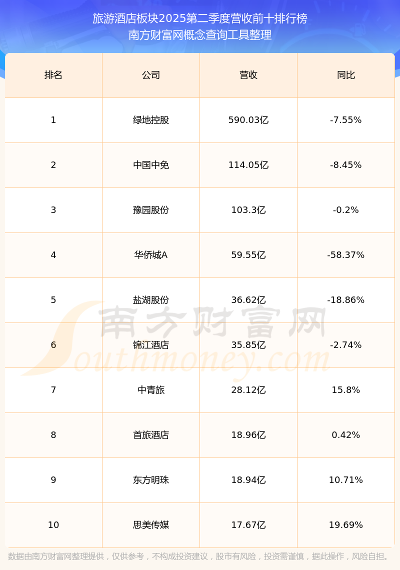 按照南方財富網(wǎng)概念查詢工具統(tǒng)計,該股所屬板塊為旅游酒店板塊,該板塊共有69只股票,曲江文旅2025第二季度營收在該板塊中排名為第34名,該板塊2025第二季度營收排名前十的股票如下表: