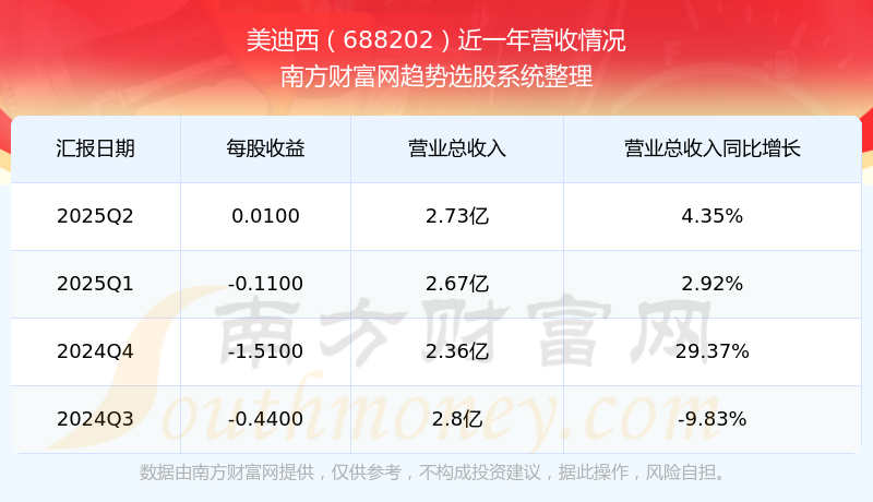 財(cái)報(bào)顯示,2025年第二季度美迪西營(yíng)收2.73億元,同比增長(zhǎng)4.35%,凈利潤(rùn)164.85萬元,同比增長(zhǎng)105.05%。