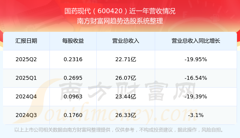 國藥現(xiàn)代2025年第二季度顯示,公司主營收入22.71億元,同比-19.95%;歸母凈利潤3.11億元,同比-19.77%;扣非凈利潤2.91億元,同比-18.64%;