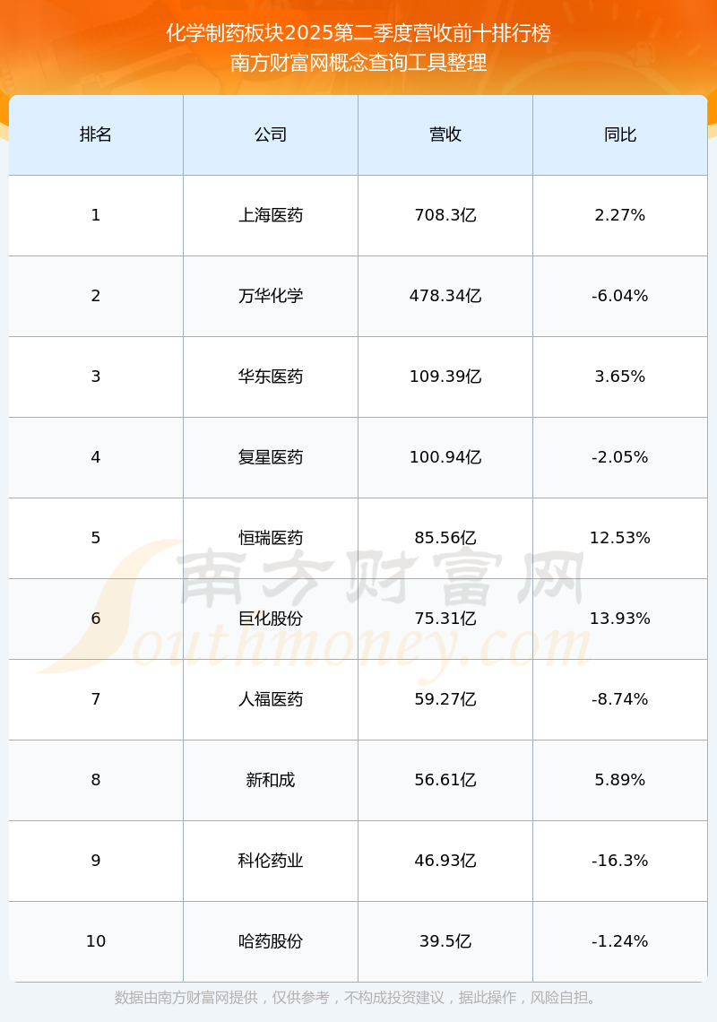 按照南方財(cái)富網(wǎng)概念查詢工具統(tǒng)計(jì),該股所屬板塊為化學(xué)制藥板塊,該板塊共有175只股票,國藥現(xiàn)代2025第二季度營收在該板塊中排名為第22名,該板塊2025第二季度營收排名前十的股票如下表: