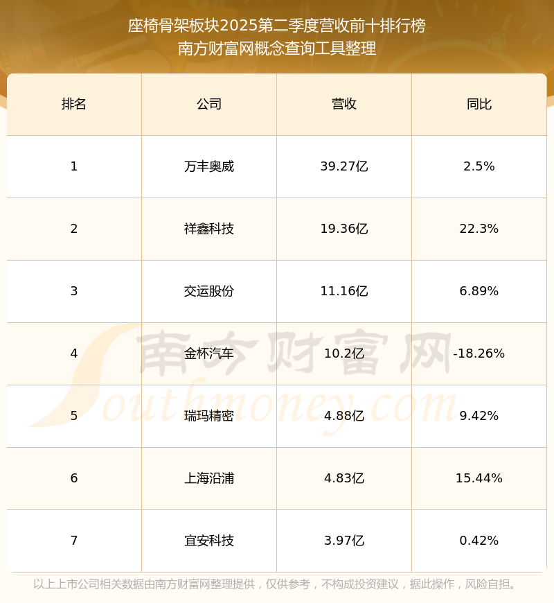 按照南方財富網概念查詢工具統(tǒng)計,該股所屬板塊為座椅骨架板塊,該板塊共有7只股票,上海沿浦2025第二季度營收在該板塊中排名為第6名,該板塊2025第二季度營收排名前十的股票如下表: