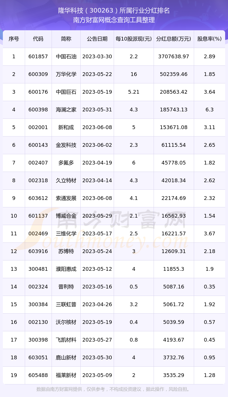 按照南方財富網(wǎng)趨勢選股系統(tǒng)統(tǒng)計,隆華科技所屬行業(yè)為節(jié)能環(huán)保行業(yè),節(jié)能環(huán)保行業(yè)分紅排名情況如下表: