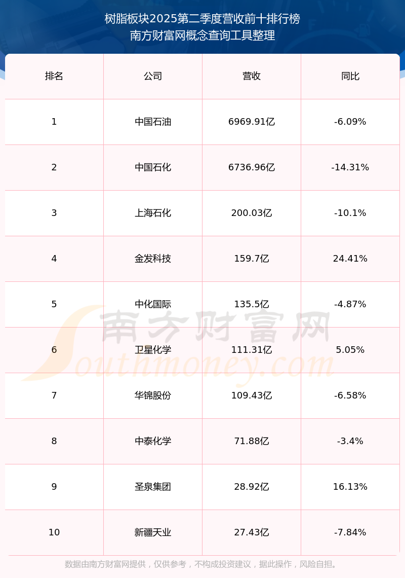 按照南方財富網(wǎng)概念查詢工具統(tǒng)計,該股所屬板塊為樹脂板塊,該板塊共有33只股票,中研股份2025第二季度營收在該板塊中排名為第33名,該板塊2025第二季度營收排名前十的股票如下表: