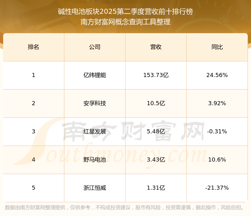 按照南方財富網概念查詢工具統(tǒng)計,該股所屬板塊為堿性電池板塊,該板塊共有5只股票,野馬電池2025第二季度營收在該板塊中排名為第4名,該板塊2025第二季度營收排名前十的股票如下表: