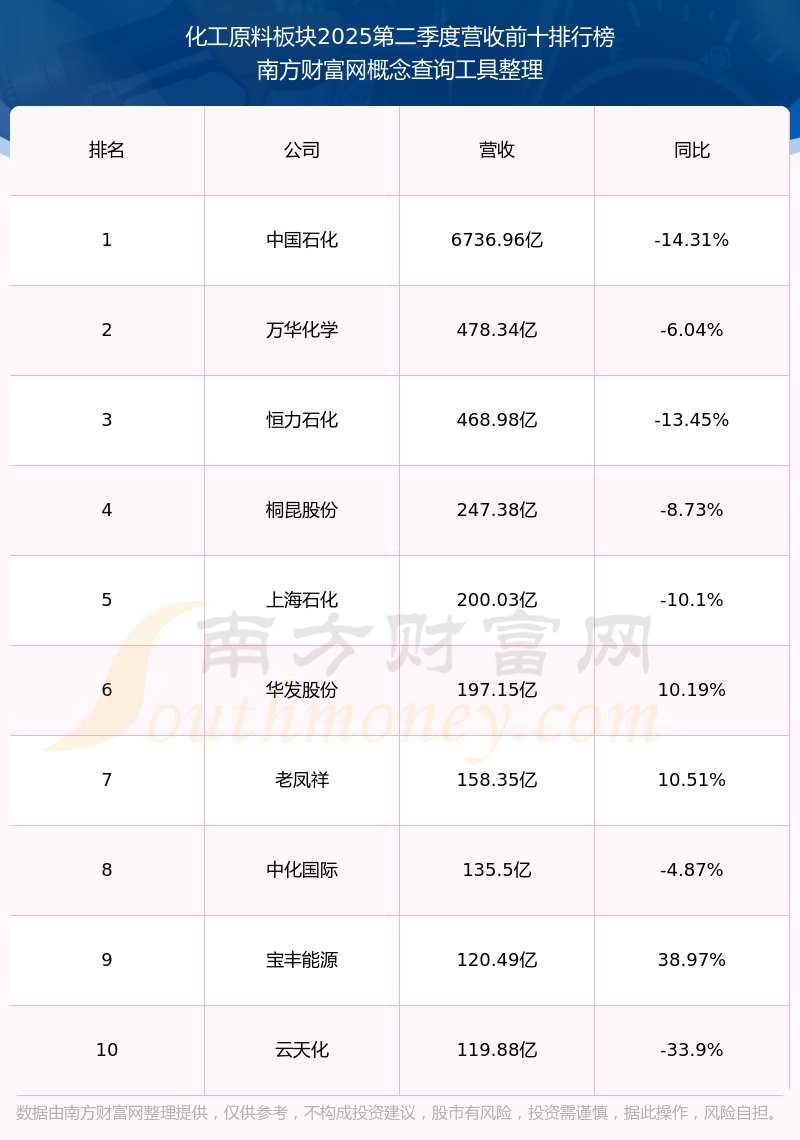 按照南方財(cái)富網(wǎng)概念查詢工具統(tǒng)計(jì),該股所屬板塊為化工原料板塊,該板塊共有123只股票,巨化股份2025第二季度營(yíng)收在該板塊中排名為第16名,該板塊2025第二季度營(yíng)收排名前十的股票如下表: