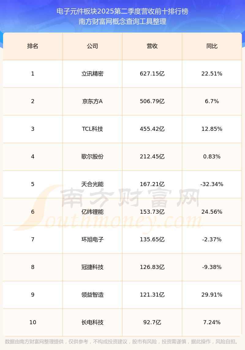 按照南方財富網(wǎng)概念查詢工具統(tǒng)計,該股所屬板塊為電子元件板塊,該板塊共有354只股票,景旺電子2025第二季度營收在該板塊中排名為第39名,該板塊2025第二季度營收排名前十的股票如下表: