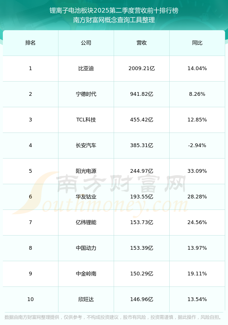 按照南方財(cái)富網(wǎng)概念查詢工具統(tǒng)計(jì),該股所屬板塊為鋰離子電池板塊,該板塊共有138只股票,珠海冠宇2025第二季度營(yíng)收在該板塊中排名為第30名,該板塊2025第二季度營(yíng)收排名前十的股票如下表: