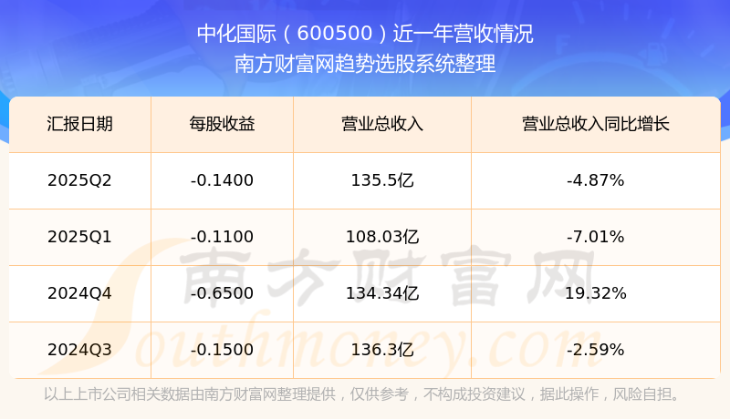 中化國際(600500)發(fā)布2025年第二季度財(cái)報(bào)。2025年第二季度中化國際實(shí)現(xiàn)營業(yè)收入135.5億元,同比增加-4.87元%,環(huán)比增加25.43%;凈利潤為-4.9億元,同比增長-264.23%,環(huán)比增長-23.56%。