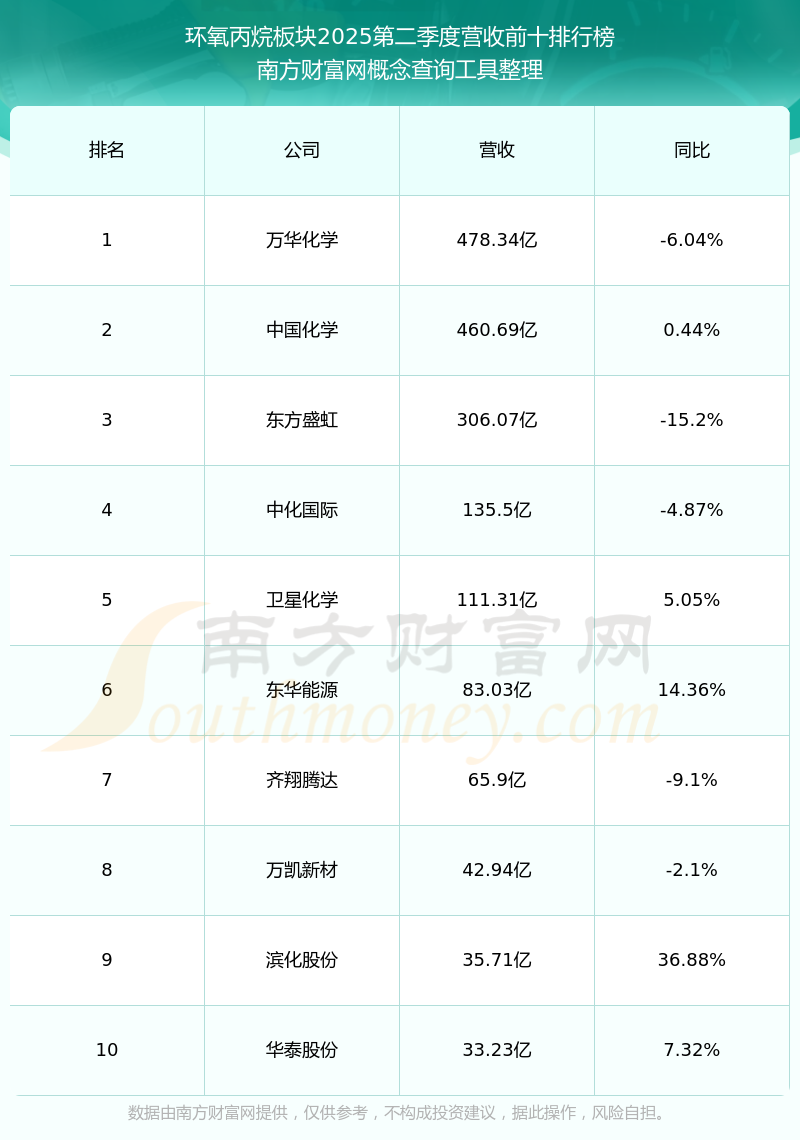 按照南方財(cái)富網(wǎng)概念查詢工具統(tǒng)計(jì),該股所屬板塊為環(huán)氧丙烷板塊,該板塊共有33只股票,中化國際2025第二季度營收在該板塊中排名為第4名,該板塊2025第二季度營收排名前十的股票如下表: