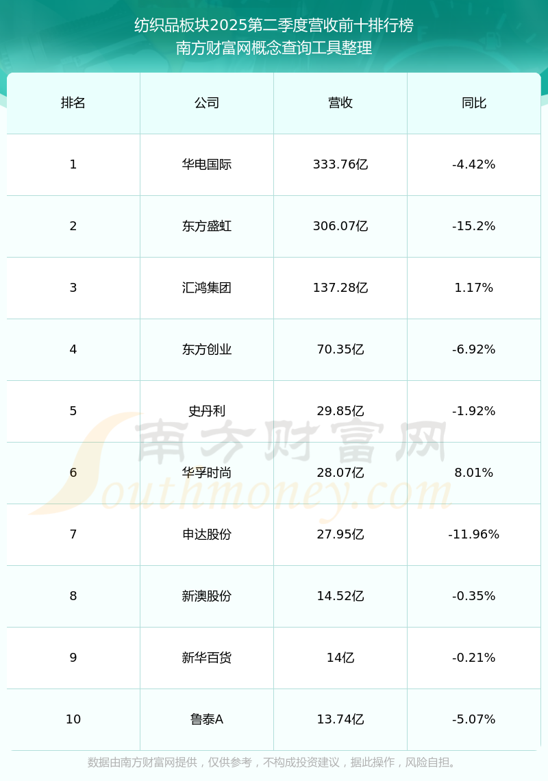 按照南方財富網(wǎng)概念查詢工具統(tǒng)計,該股所屬板塊為紡織品板塊,該板塊共有32只股票,眾望布藝2025第二季度營收在該板塊中排名為第32名,該板塊2025第二季度營收排名前十的股票如下表: