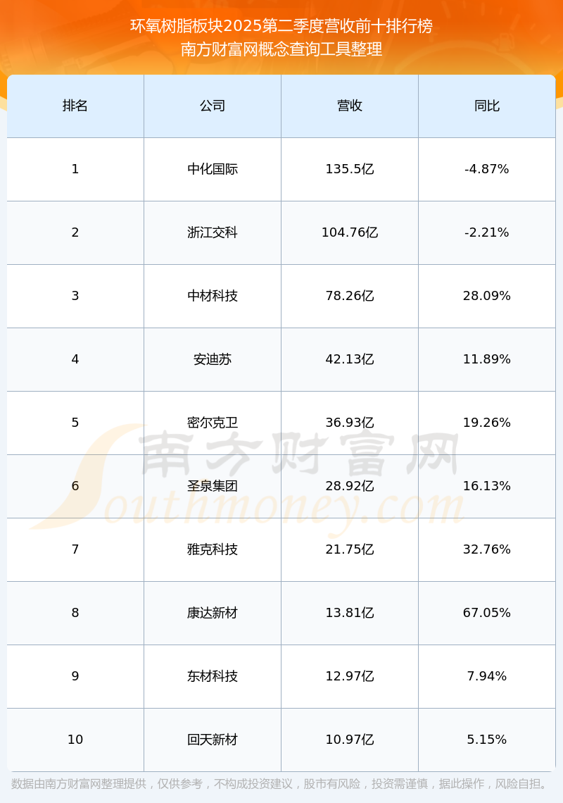 按照南方財(cái)富網(wǎng)概念查詢工具統(tǒng)計(jì),該股所屬板塊為環(huán)氧樹脂板塊,該板塊共有22只股票,宏昌電子2025第二季度營收在該板塊中排名為第12名,該板塊2025第二季度營收排名前十的股票如下表: