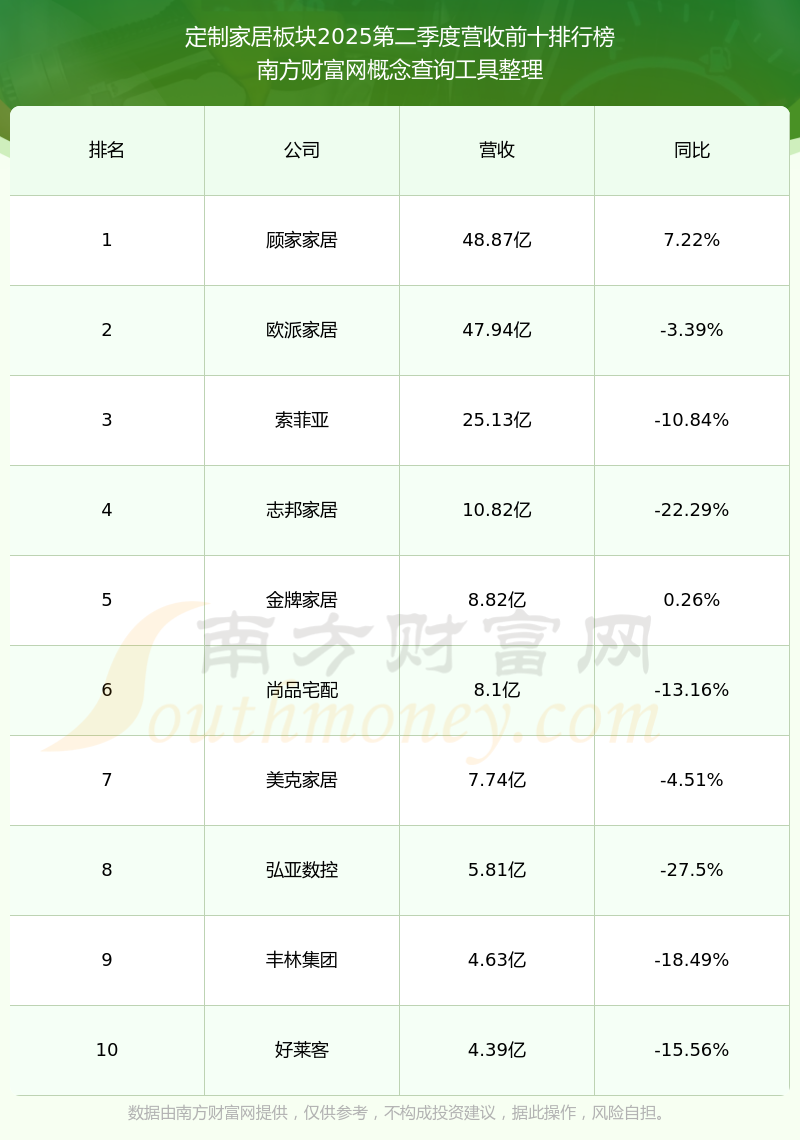 按照南方財富網(wǎng)概念查詢工具統(tǒng)計,該股所屬板塊為定制家居板塊,該板塊共有13只股票,志邦家居2025第二季度營收在該板塊中排名為第4名,該板塊2025第二季度營收排名前十的股票如下表: