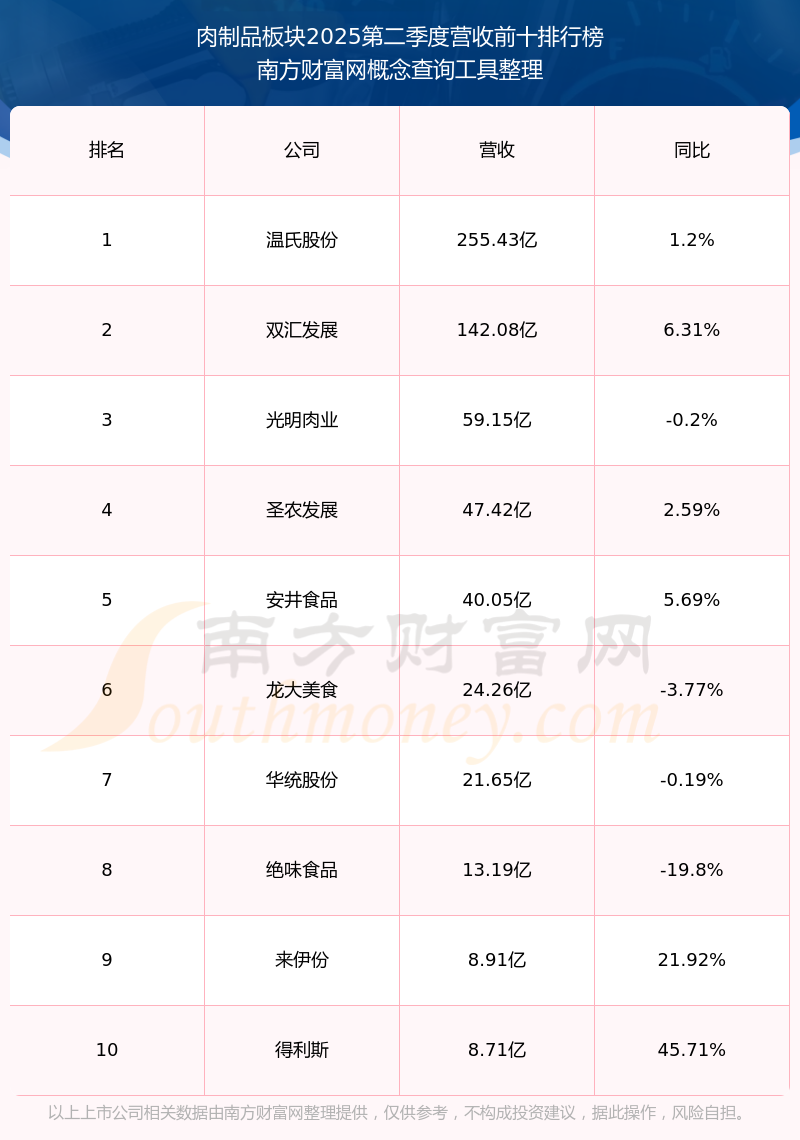 按照南方財(cái)富網(wǎng)概念查詢工具統(tǒng)計(jì),該股所屬板塊為肉制品板塊,該板塊共有18只股票,春雪食品2025第二季度營(yíng)收在該板塊中排名為第18名,該板塊2025第二季度營(yíng)收排名前十的股票如下表: