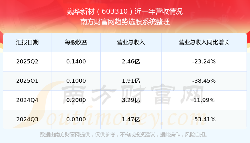 巍華新材發(fā)布2025年第二季度財(cái)報(bào)。實(shí)現(xiàn)總營(yíng)收2.46億元,同比增長(zhǎng)-23.24%;扣非凈利潤(rùn)同比增長(zhǎng)-45.9%至4677.13萬元。