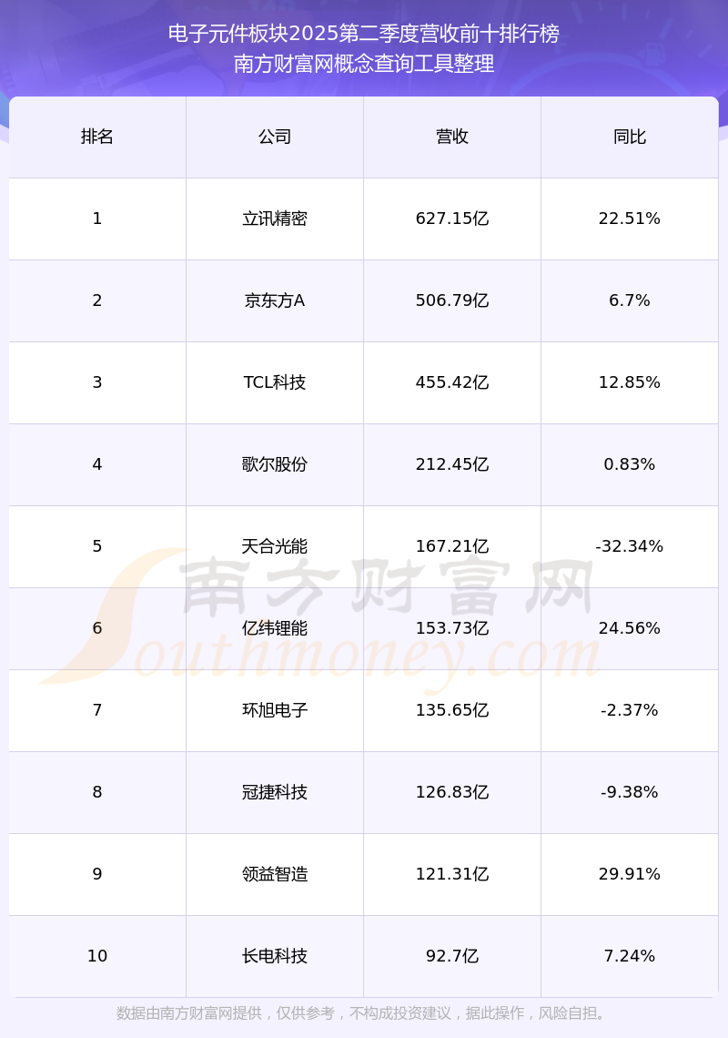 按照南方財(cái)富網(wǎng)概念查詢工具統(tǒng)計(jì),該股所屬板塊為電子元件板塊,該板塊共有354只股票,維科技術(shù)2025第二季度營(yíng)收在該板塊中排名為第219名,該板塊2025第二季度營(yíng)收排名前十的股票如下表: